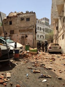 وأوضح المتحدث الأمني أن أحد المواقع في محافظة جدة، والآخرَين بالعاصمة المقدسة، الأول بحي العسيلة، والثاني بحي أجياد المصافي الواقع داخل محيط المنطقة المركزية للمسجد الحرام، عبارة عن منزل مكون من ثلاثة أدوار كان يوجد بداخله الانتحاري المكلف بالتنفيذ، والذي بادر فور مباشرة رجال الأمن في محاصرته بإطلاق النار باتجاههم مما اقتضى الرد عليه بالمثل لتحييد خطره بعد رفضه التجاوب مع دعواتهم له بتسليم نفسه، واستمر في إطلاق النار بشكل كثيف قبل أن يقدم على تفجير نفسه، مما نتج عنه مقتله وانهيار المبنى الذي كان يتحصن بداخله وإصابة (6) من الوافدين نقلوا على أثره للمستشفى بالإضافة إلى إصابة (5) من رجال الأمن بإصابات طفيفة.