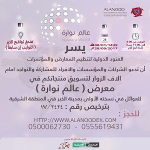 برعاية اعلامية من “المختصر الاخبارية ”  وبحضور الفنانة ليلى السلمان  وعدد كبير من الاعلاميين  والسنابيين دشنت  مؤسسة “ رؤية معارض المستقبل ” لتنظيم المعارض والمؤتمرات بفندق توقيع  بالخبر  مساء يوم الثلاثاء الماضي 03/07/1439هـ الموافق 20/03/2018م معرضها الذي تعتزم المؤسسة اقامته تحت عنوان “اضواء الربيع ”  الذي تنظمه خلال الفترة من من 28 مارس 2018م  حتى 1 ابريل 2018 بفندق توقيع الخبر .