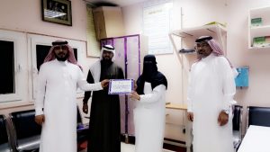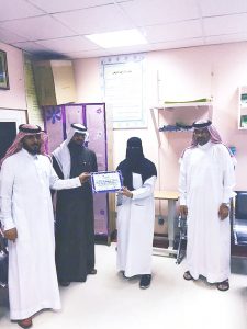 حيث جاء التكريم الذي تم صباح يوم أمس الاحد 01/10/1438هـ  اول ايام عيد الفطر السعيد بتنظيم من قسم السكن بالمستشفى عرفانا وتقديرا لجهود الممرضة نوال المرزوقي  وتفانيها اثناء مشاركتها في الاشراف والتنسيق على شئون سكن تمريض الدعم  اضافة لعملها وتميزها في ذلك