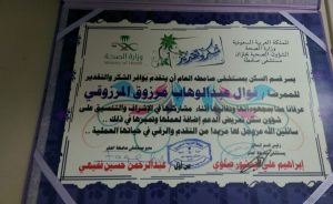 تقديرا لجهودها المتميزة التي بذلتها ولا زالت تبذلها كرمت الشئون الصحية بجازان ممثلة في قسم السكن بمستشفى صامطة  العام الممرضة نوال بنت عبدالوهاب مرزوق المرزقي  والمنتدبة من الشئون الصحية بالمنطقة الشرقية للعمل ضمن الطاقم التمريضي الذي يقوم بتقديم الخدمات التمريضية والرعاية الصحية لجنودنا البواسل في الحد الجنوبي .