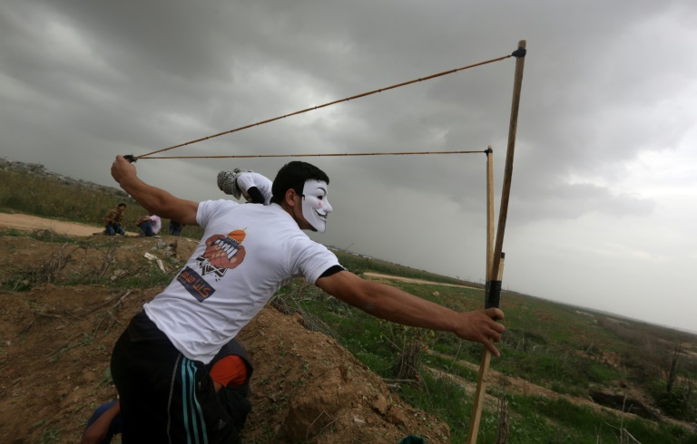 فلسطيني يستخدم مقلاعا كبيرا لرشق حجارة باتجاه القوات الاسرائيلية قرب الشجاعية شرق مدينة غزة على حدود القطاع واسرائيل
