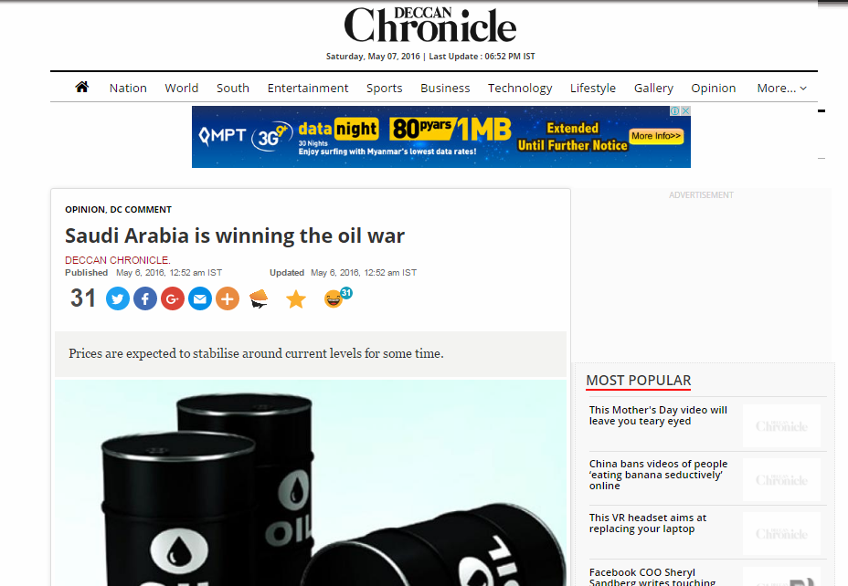 قالت صحيفة “ديكان كرونيكل” الهندية في افتتاحيتها: “إن السعودية يبدو أنها تنتصر في حرب النفط التي أعلنتها على الولايات المتحدة العام الماضي بعد طلب 59 شركة نفط وغاز في أمريكا إعلان إفلاسها، وهناك عدد آخر من الشركات في طريقه للإفلاس”.وتحدثت الصحيفة عن أن هناك توقعات بأن عدد شركات النفط والغاز الأمريكية التي تتجه للإغلاق ستتجاوز عدد شركات الاتصالات التي أغلقت في 2002 و2003م بسبب الكساد وعددها 68 شركة.وأضافت أن السعودية بدا وكأنها تخسر حربها العام الماضي عندما قام منتجو النفط الصخري الأمريكي بإغراق الأسواق العالمية وهو ما أدى إلى انخفاض أسعار النفط بشكل كبير، لكن في نوفمبر الماضي رفعت المملكة إنتاجها ليصل إلى 10.6 ملايين برميل يومياً.وأشارت إلى أن الوضع يبدو قاتماً للغاية بالنسبة لمنتجي النفط الصخري لأن المملكة يبدو أنها لن تتراجع في المستقبل القريب حتى تخرج شركات النفط الصخري من الاستثمار.وذكرت أن هناك تقارير تشير إلى أن استخراج برميل النفط يكلف السعودية 10 دولارات فقط بينما يكلف الشركات الأمريكية من 60 إلى 70 دولاراً، وبالتالي فإن سعر برميل النفط حالياً يجعل من الصعب على الشركات الأمريكية البقاء في المنافسة، كما أن البنوك توقفت عن إعطاء تلك الشركات المال لعلمها بأنها لن تتمكن من إعادته.وتوقعت الصحيفة أن يستمر استقرار سعر برميل النفط عد المستويات الراهنة لبعض الوقت.
