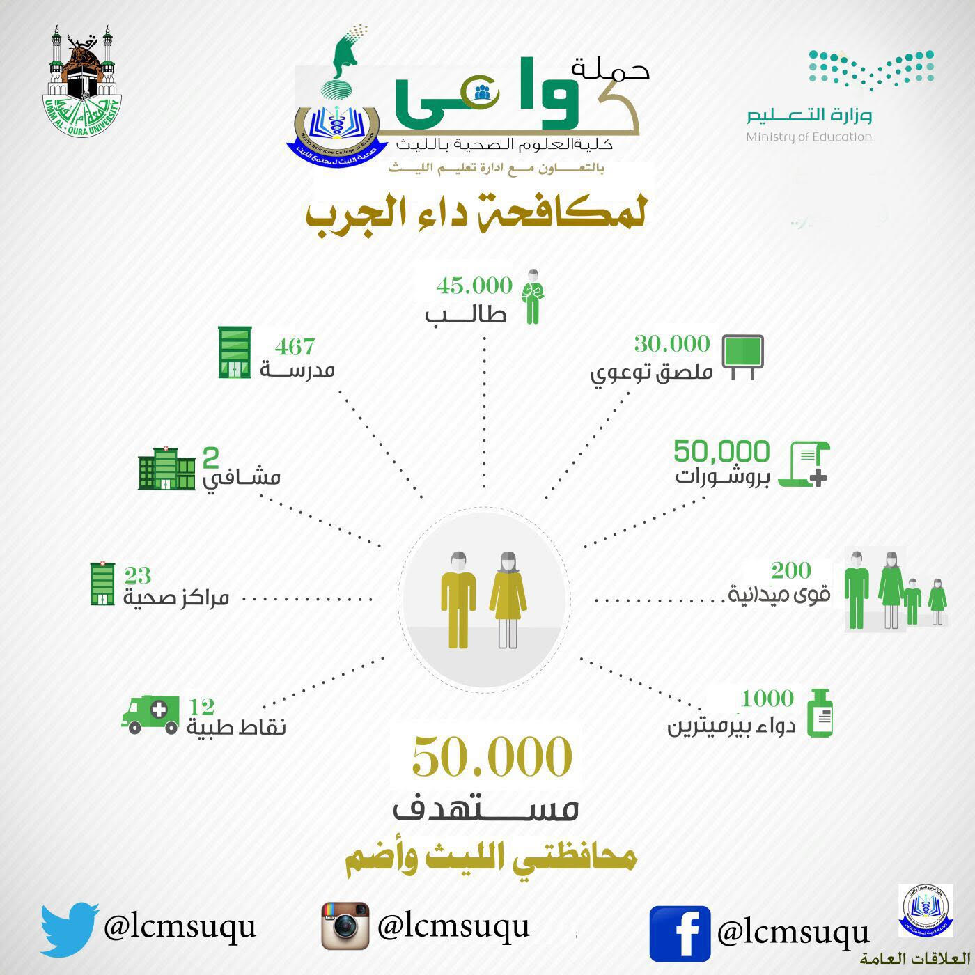 كما كشف عميد كلية العلوم الصحية بالليث الدكتور فارس بن محمد نور ألطف بأن الكلية تكثف برامجها التوعوية والتثقيفية المرتبطة بالوقاية من داء الجرب الجلدي؛ ضمن حملتها كن واعي موزعة على 12 فرقة ميدانية بهدف تثقيف المجتمع، عبر أساليب التوعوية الحديثة من خلال توزيع أكثر 50 ألف برشور توعوي و 20 ألاف رسالة sms ونشرات إذاعية ومقاطع مصورة عبر برامجها في مواقع التواصل الاجتماعي المختلفة.
