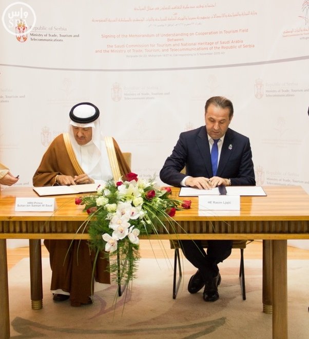 ووقع المذكرة صاحب السمو الملكي الأمير سلطان بن سلمان بن عبدالعزيز رئيس ‏الهيئة العامة للسياحة والتراث الوطني، ومعالي نائب رئيس الوزراء وزير التجارة والسياحة والاتصالات بجمهورية صربيا راسم ليايتش، بحضور سفير خادم الحرمين الشريفين في جمهورية البوسنة والهرسك هاني بن عبدالله مؤمنة، والوفد المرفق لسمو رئيس ‏الهيئة العامة للسياحة والتراث الوطني.