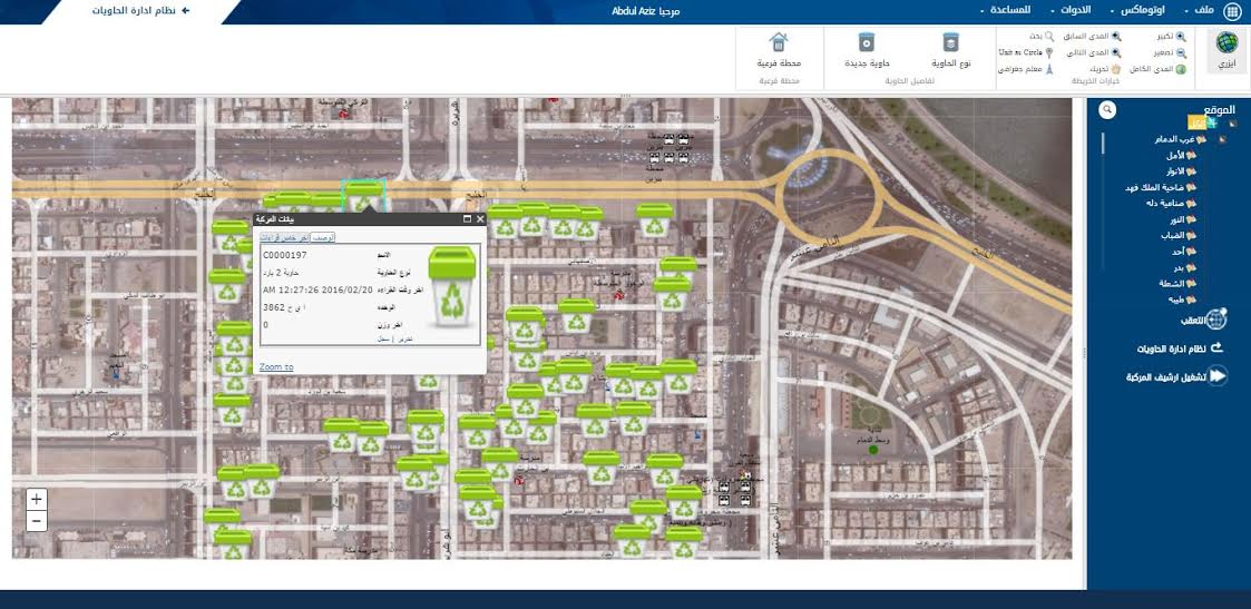 وقال أيضاً أن نظام مراقبة الحاويات يعتبر من أهم الأنظمة بالبرنامج وأن أهم خصائصه هو تركيب بطاقات RFID بالحاويات وإدخال بيانات الحاوية بالبطاقة عند التركيب وقراءة بيانات البطاقة مع كل عملية جمع للنفايات عبر الـ RFIDالمحمول بواسطة فرق جمع النفايات وكذلك الأرسال الألي لمعلومات الحاوية إضافة إلى عرض مواقع الحاويات على الخرائط الإلكترونية وإتاحة تقارير توزيع الحاويات حسب المناطق الجغرافية ثم إتاحة تقارير الحاويات التي لم يتم جمع النفايات منها لمدة محددة من الزمن.