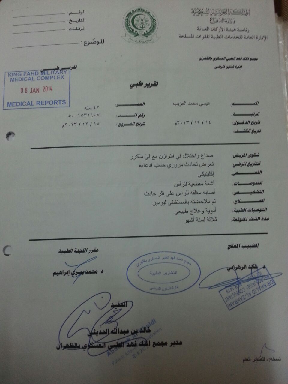 والدتي مريضه بالفشل الكلوي و تحتاج إلى رعاية صحيه خاصه ( تحتاج لجلسات غسل كلوي ثلاث مرات بالاسبوع ) ويوجد عندي تقرير طبي لوضعها الصحي  ,و خلال زياراتي اليومية إلى الاحساء لزيارة والدتي تعرضت لحادث أثر على وضعي الصحي وقد أصبت بجلطة بالراس وبلطف من الله نجوت منها بلطف من الله ومنعت من القيادة فلم أعد قادر على القيادة من  أجل الاطمئنان على عائلتي.