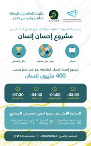 ينطلق الثلاثاء 30 يناير 2018م منتدى “إحسان إنسان” لتدشين مشروع وفريق احسان انسان، والذي يعتبر المبادرة السعودية الأولى من نوعها لدمج الصم وضعاف السمع في المجتمع، ويهدف المنتدى لتعزيز الجهود لخدمة فئة مهمة في مجتمعنا حيث يفوقون المليون أصم وضعيف سمع في المملكة و400 مليون على مستوى العالم، وتأتي هذه المبادرة لحل مشكلة تواصلهم مع المجتمع واندماجهم من خلال تطبيق الكتروني يعتبر المشروع الوطني التقني الأول والوحيد من نوعه على مستوى العالم، لينطلق هذا الاختراع من العاصمة الرياض .