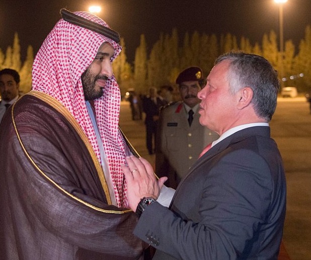 وصل صاحب السمو الملكي الأمير محمد بن سلمان بن عبدالعزيز آل سعود ولي ولي العهد النائب الثاني لرئيس مجلس الوزراء وزير الدفاع اليوم إلى المملكة الأردنية الهاشمية .وكان في استقبال سمو ولي ولي العهد لدى وصوله مطار الملك الحسين في العقبة جلالة الملك عبدالله الثاني بن الحسين ملك المملكة الأردنية الهاشمية ومعالي مستشار جلالة الملك للشؤون العسكرية رئيس هيئة الأركان الأردني الفريق أول ركن مشعل الزبن.