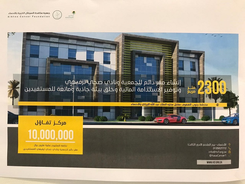 أعلنت جمعية مكافحة السرطان الخيرية في الأحساء “تفاؤل” خلال حفلها السنوي عن تفاصيل حملتها الجديدة لعام 2019م وهي إنشاء مبنى “مركز تفاؤل” الإداري والترفيهي وذلك بتكلفة 10,000,000 ملايين ريال، وعلى مساحة تقدر بـــ 2300متر مربع، وتستمر هذه الحملة لمدة عام كامل، تتخللها العديد من الأنشطة والبرامج والفعاليات بهدف جمع التبرعات لبناء هذا المشروع والذي سوف يساهم في الاستدامة المالية للجمعية ويخدم مرضى السرطان وذويهم في الأحساء.