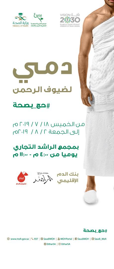 حملة التبرع بالدم تحت عنوان (دمي لضيوف الرحمن لعام ١٤٤٠) وذلك يوم الخميس في تمام الساعه ٩:٠٠م الموافق ١٨يوليو ٢٠١٩م بمجمع الراشد ، والتي تعد أكبر حملة رجالية نسائية على مستوى المملكة، ويتم على ضوئها إقامة المعرض التثقيفي عن ثقافة التبرع بالأعضاء وأركان توعوية وثقافية وترفيهية لكافة شرائح المجتمع.