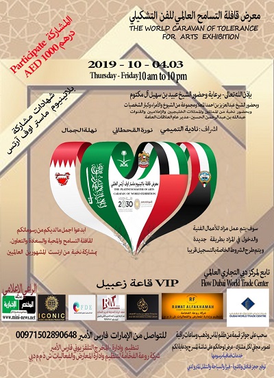 برعاية اعلامية من “صحيفة المختصر الاخبارية” – يقام في دبي معرض ومزاد ” قافلة التسامح العالمي للفن التشكيلي ” في 3 / 4 أكتوبر بقاعة نادي زعبيل لسيدات دبي التابع لمركز دبي التجاري العالمي، وذلك برعاية الشيخ عبيد بن سهيل آل مكتوم وبحضور الشيخ عبدالعزيز بن أحمد المعلا ومجموعة من كبار الشخصيات من الإمارات والمملكة العربية. ينظم المعرض المخرج التلفزيوني فارس الأمير ومدير عام شركة روعة الفخامة لتنظيم وإدارة المعارض والفعاليات. ويستضيف المعرض عددا من االفنانين العرب الذين سيحضرون المعرض والمزاد دعما لقيم التسامح في عام التسامح.