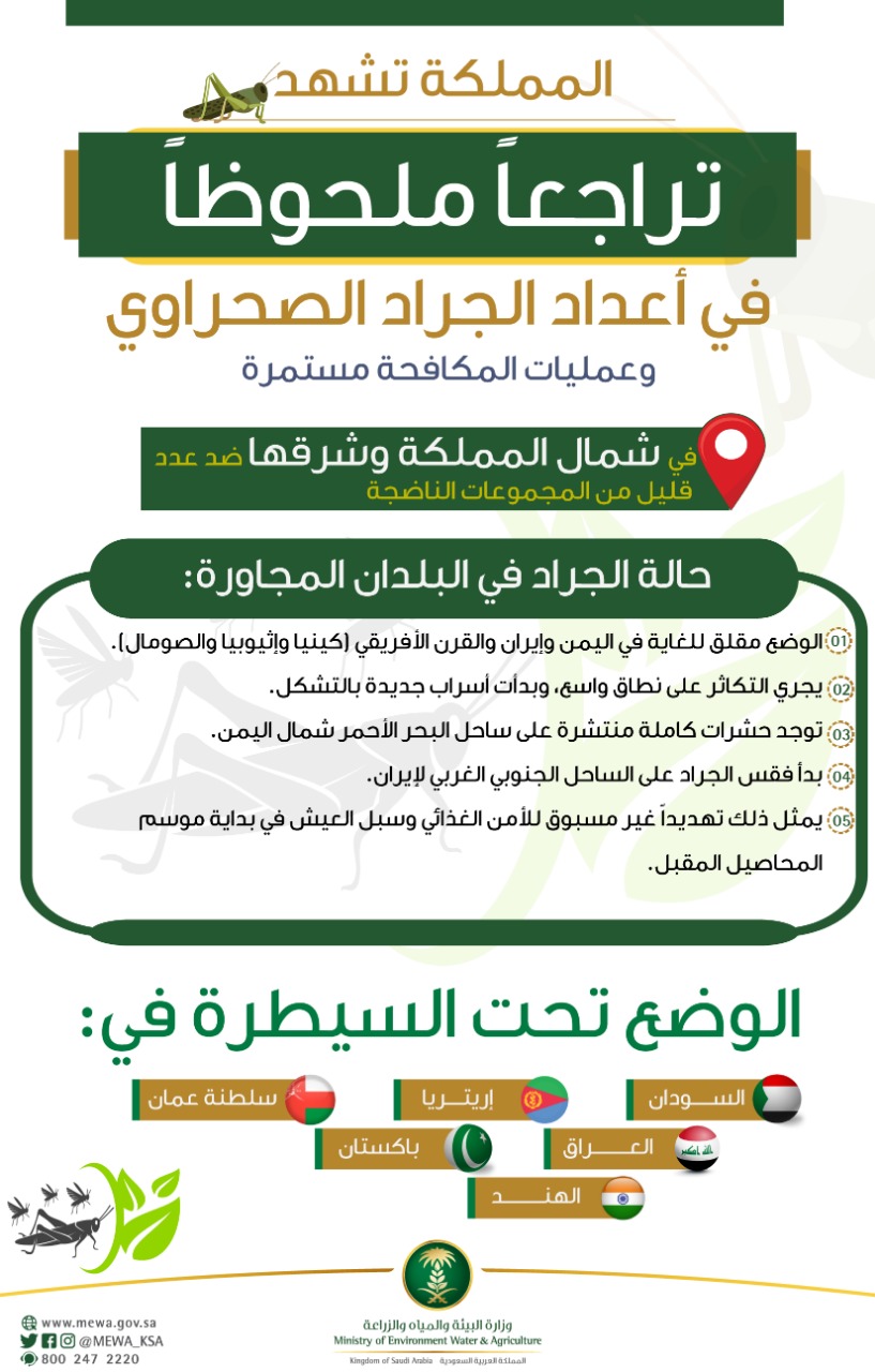 وفي المقابل، أكدت الوزارة أن الوضع تحت السيطرة في كلٍّ من السودان وإريتريا وسلطنة عمان والعراق وباكستان والهند، حيث تجري عمليات مكافحة الجراد في تلك الدول باستمرار، مع ملاحظة انخفاضٍ في أعدادها هناك.