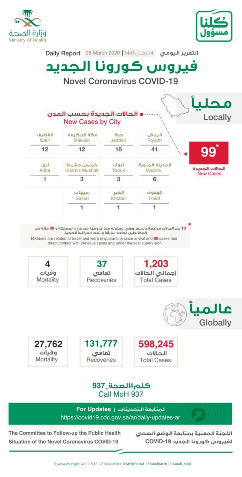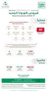 وأضاف متحدث “الصحة” الدكتور محمد العبدالعالي خلال الإيجاز الصحفي الدوري للحديث عن آخر مستجدات فيروس “كورونا” أن إجمالي الحالات في المملكة وصل إلى 1203 حالة حتى الآن.