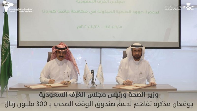 وقع وزير الصحة رئيس مجلس إدارة صندوق الوقف الصحي الدكتور توفيق الربيعة، ورئيس مجلس الغرف السعودية عجلان العجلان مذكرة تفاهم لتعزيز التعاون المشترك وتمكين قطاع الأعمال وأجهزته المؤسسية، لدعم صندوق الوقف الصحي في مواجهة جائحة كورونا.
