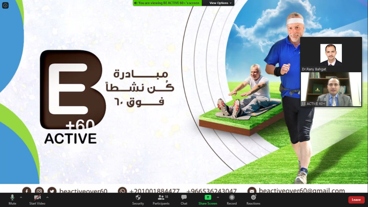 اختتمت فعاليات المؤتمر الدولي الأول (كن نشطاً +60) بتاريخ 26 ديسمبر 2020 والذي أقامته مبادرة كن نشطاُ فوق 60 بالتعاون مع الاتحاد العربي للثقافة الرياضية والمنظمة الأوربية لألعاب القوى للأساتذة عبر المنصة الإلكترونية Zoom وبمشاركة أكاديميين ومهتمين ورياضيين وإعلاميين من (18) دولة عربية وأجنبية وتعدى حجم المتابعة لليث المباشر أكثر من 10.000 عشرة آلاف متابع، ومن أبرز شركاء نجاح المؤتمر خيمة التواصل العالمية / مصر، التميز للاستشارات الرياضية بالكويت، الاتحاد الرياضي المصري للجامعات، الاكاديمية العلمية للبحث والتدريب بلندن، أكاديمية ببلس للتدريب والتنمية، جمعية الاجتماعيين بالامارات.