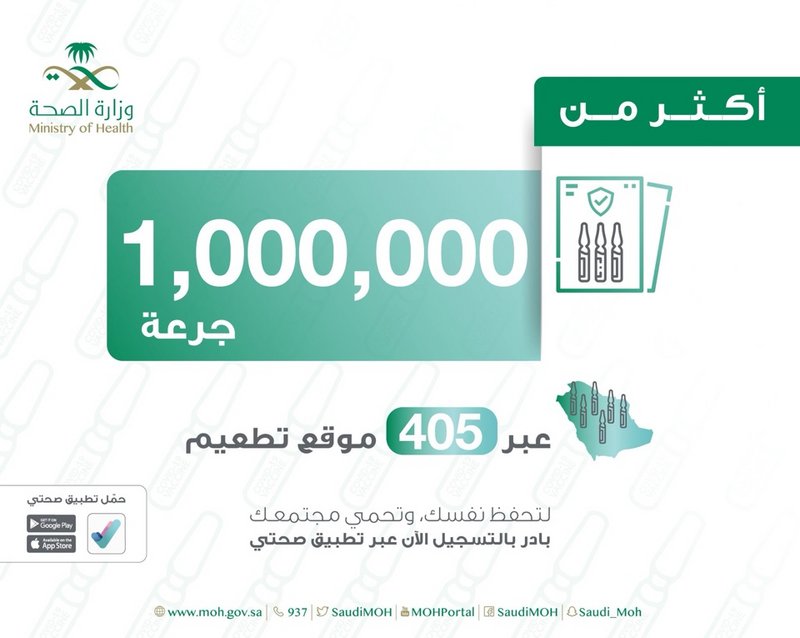 وصرحت الوزارة عبر حسابها الرسمي بـ”تويتر” بأن “أكثر من (1.000.000) جرعة من لقاح كورونا (كوفيد-19) تم إعطاؤها حتى الآن من خلال (405) مواقع للتطعيم في مناطق السعودية كافة “.