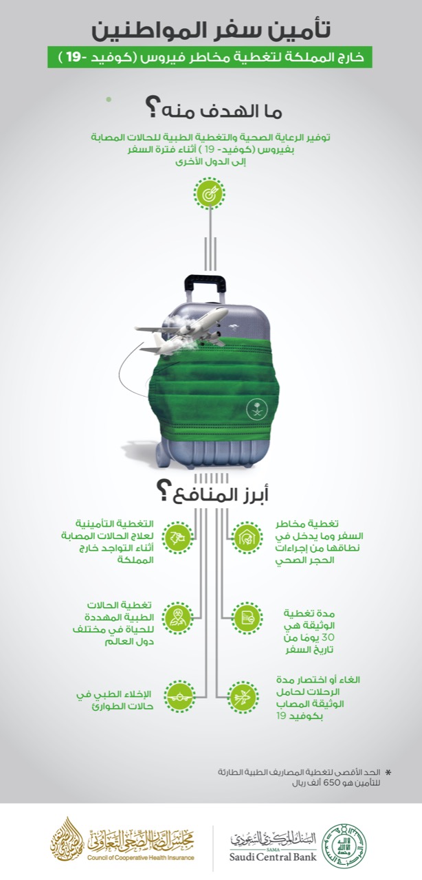 يعلن البنك المركزي السعودي ومجلس الضمان الصحي التعاوني، اعتماد منتج تأمين سفر المواطنين خارج المملكة العربية السعودية، متضمناً منافع تُغطي مخاطر الإصابة بفيروس كورونا (كوفيد – 19).