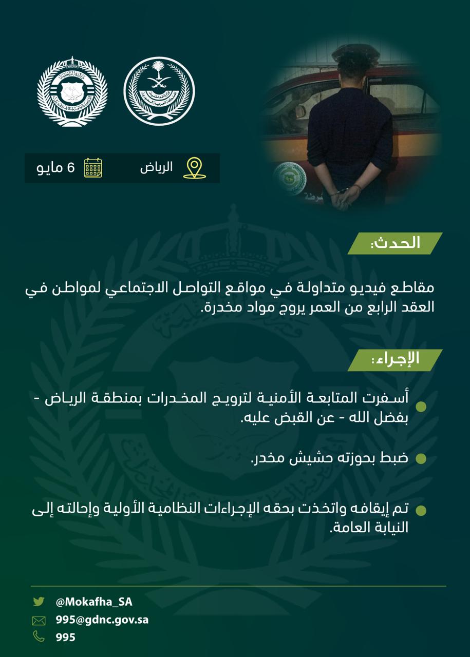 صرح المتحدث الرسمي للمديرية لمكافحة المخدرات النقيب محمد النجيدي، أنه إشارة إلى مقاطع الفيديو المتداولة في مواقع التواصل الاجتماعي لشخص يروج مواد مخدرة، فقد أسفرت المتابعة الأمنية لمروجي المخدرات بمنطقة الرياض – بفضل الله – عن القبض عليه، وهو مواطن في العقد الرابع من العمر، وضبط بحوزته حشيش مخدر، وجرى إيقافه، واتخذت بحقه الإجراءات النظامية الأولية، وإحالته إلى النيابة العامة.