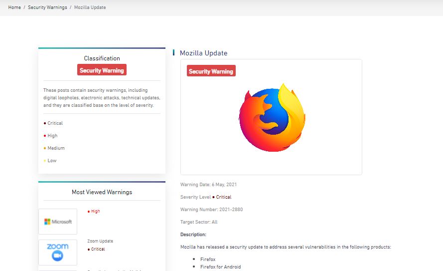 وأصدر المركز اليوم تحذيرًا عالي الخطورة بشأن ثغرات في متصفح فايرفوكس مشيرًا إلى أن هذه الثغرات تُمكن المهاجم من استغلالها في تنفيذ برمجيات خبيثة، وتنفيذ هجمة البرمجة عبر المواقع Cross-site scripting (XSS).