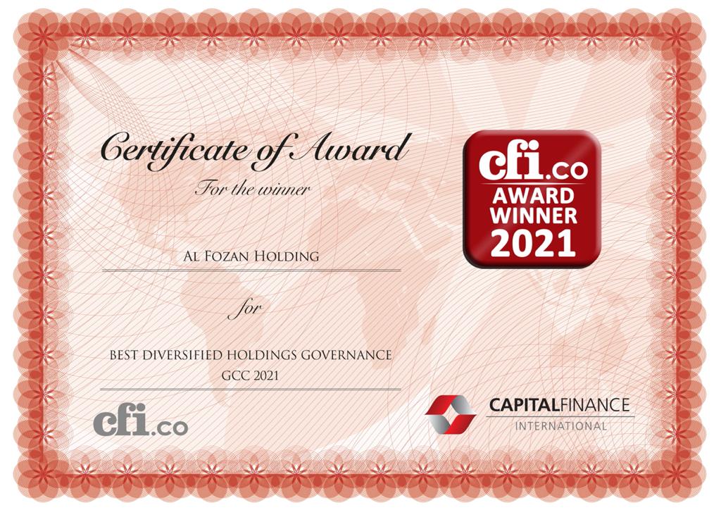 أعلنت شركة الفوزان القابضة عن فوزها بجائزة التميز كأفضل شركة قابضة في مجال الحوكمة بمنطقة الخليج للعام 2020/2021 وهي جائزة عالمية تمنحها مجلة Capital Finance International البريطانية، المهتمة بالدراسات والأبحاث وتهدف من خلالها إلى تحفيز أداء الشركات المتميزة حول العالم وتقديم تجارب ملهمة تفيد الجهات المستهدفة وتسهم بتعزيز التقارب الاقتصادي.