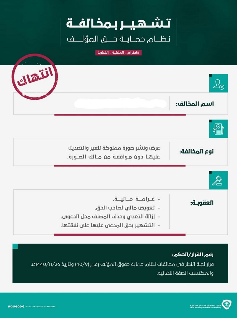 غرّمت الهيئة السعودية للملكية الفكرية أحد الفنادق الكبيرة المعروفة؛ نتيجة عرض ونشر صورة مملوكة للغير ونشرها والتعديل عليها دون الحصول على موافقة من صاحب الحق، وفرضت لمصلحته تعويضاً عمّا لحق به.