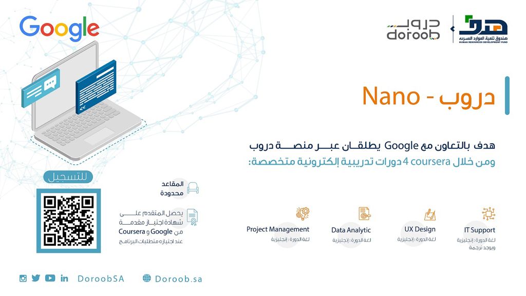 أكد صندوق تنمية الموارد البشرية (هدف)، أن الدورات التدريبية الإلكترونية التي يتم تقديمها من خلال برنامج (دروب- Nano) تغطي 4 مجالات: IT Support، UX Design، Data Analytic، Project Management، وذلك بالشراكة والتعاون مع Google ومن خلال منصة Coursera أحد أشهر المنصات العالمية للتدريب الإلكتروني.