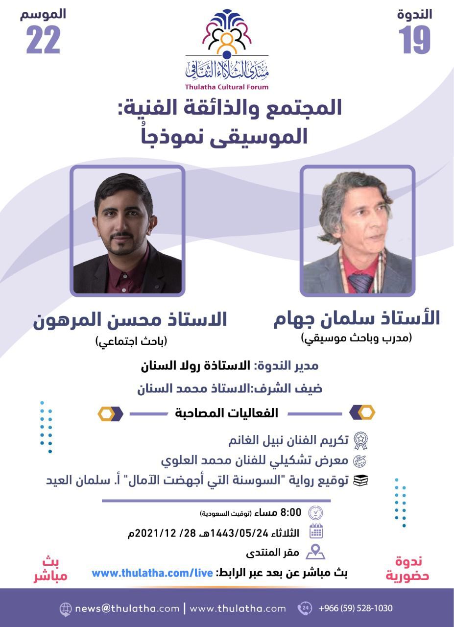 يستضيف منتدى الثلاثاء الثقافي في ندوته الأسبوعية في الساعة الثامنة من مساء اليوم الثلاثاء باحثين في مجال الموسيقى والمجتمع للحديث حول “المجتمع والذائقة الفنية: الموسيقى نموذجا” ضمن برنامجه الثقافي للموسم 22. ويشارك في الندوة كل من رئيس لجنة الموسيقى بجمعية الثقافة والفنون بالدمام الفنان سلمان جهام، والباحث الاجتماعي الأستاذ محسن المرهون، ويدير الندوة الأستاذة رولا السنان. كما يحل الفنان الموسيقي المعروف محمد السنان كضيف شرف في هذه الندوة.
