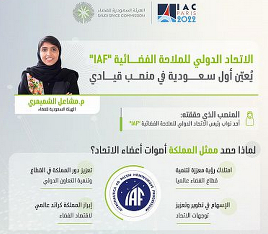 أعلن الاتحاد الدولي للملاحة الفضائية “IAF” فوز ممثل المملكة العربية السعودية المهندسة مشاعل الشميمري بمنصب نائب الرئيس للاتحاد، وذلك عقب ترشحها للمنصب وفوزها بالتصويت على أربعة عشر مرشحًا من أنحاء العالم كافة، لتكون بذلك أول امرأة سعودية تحقق الفوز بمنصب قيادي في أكبر المنظمات العالمية للفضاء “IAF”.