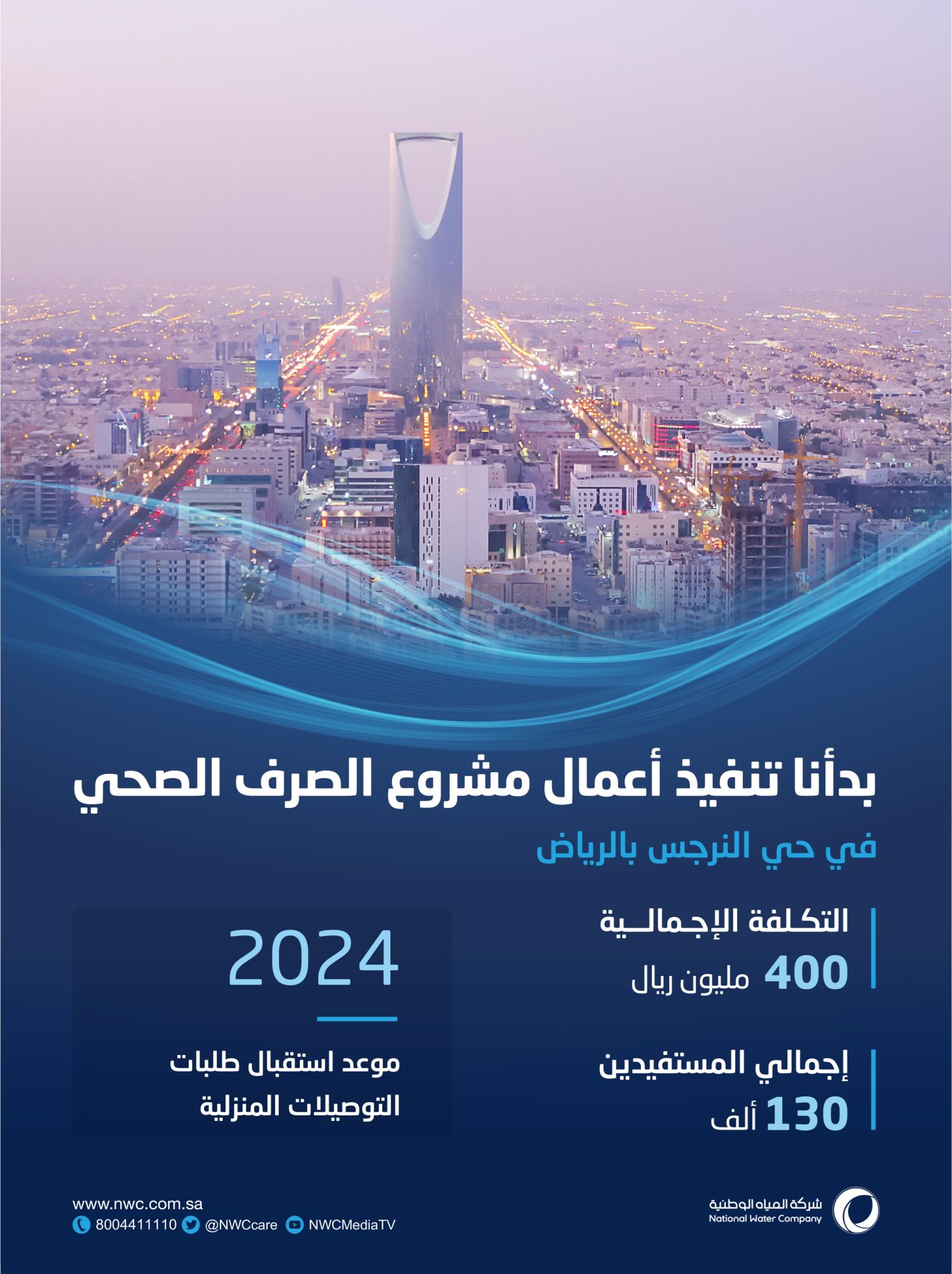 كشفت شركة المياه الوطنية أنها بدأت في تنفيذ أعمال الصرف الصحي في حي النرجس بمدينة الرياض، وذلك بتكلفة إجمالية بلغت (400) مليون ريال، يأتي ذلك ضمن جهودها المتواصلة لتنفيذ خططها الاستراتيجية لتهيئة البنى التحتية في كل من قطاعي المياه والخدمات البيئية، وانطلاقًا من مبادراتها لزيادة نسب التغطية، وتحسين الكفاءة التشغيلية.