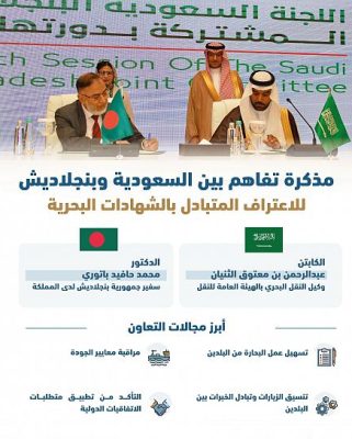 وقعت المملكة العربية السعودية ممثلة بالهيئة العامة للنقل مذكرة تفاهم للاعتراف المتبادل بشهادات البحارة بين حكومة المملكة وجمهورية بنجلاديش، حيث وقع مذكرة التفاهم وكيل الهيئة العامة للنقل البحري الكابتن عبدالرحمن بن معتوق الثنيان، ومثل الجانب البنغلاديشي في توقيع مذكرة التفاهم سفير جمهورية بنغلاديش لدى المملكة الدكتور محمد جافيد باتوري، جاء ذلك على هامش انعقاد اجتماعات الدورة الرابعة عشر للجنة السعودية البنجلاديشية المشتركة في مدينة الرياض.