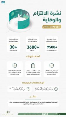 وفي السياق ذاته، أوضحت “التأمينات الاجتماعية” أنه وخلال ذات الفترة قامت بأكثر من 3600 زيارة توعوية للمنشآت وأصحاب العمل، تهدف لنشر الوعي حول نظام التأمينات الاجتماعية وتعريف أصحاب العمل بمنافع النظام وأبرز المخالفات وطرق تلافيها، كما تهدف هذه الزيارات إلى التوعية بمعايير السلامة والصحة المهنية في بيئات العمل، كما بينت المؤسسة أنه تم تقديم الدعم لـ 558 منشأة صغيرة ومتوسطة في مجال السلامة والصحة المهنية خلال شهر نوفمبر الماضي.
