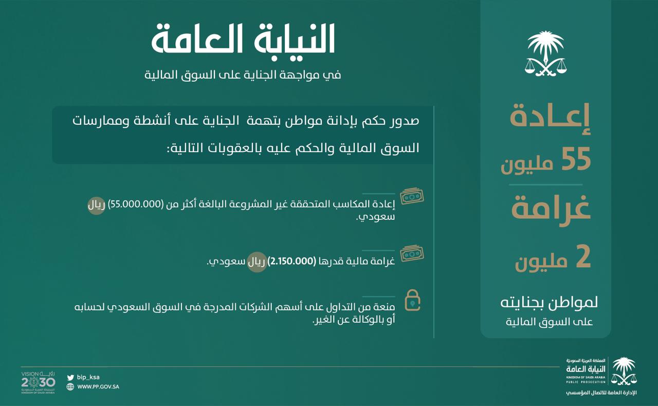 وتمت إقامة الدعوى الجزائية بحقه، وصدر بحقه الحكم المتضمن إدانته بما نسب إليه، وإلزامه بإعادة المكاسب المتحققة غير المشروعة البالغة أكثر من (55.000.000) ريال سعودي، وغرامة مالية قدرها (2.150.000) ريال سعودي، ومنعة من التداول على أسهم الشركات المدرجة في السوق السعودي لحسابه أو بالوكالة عن الغير.
