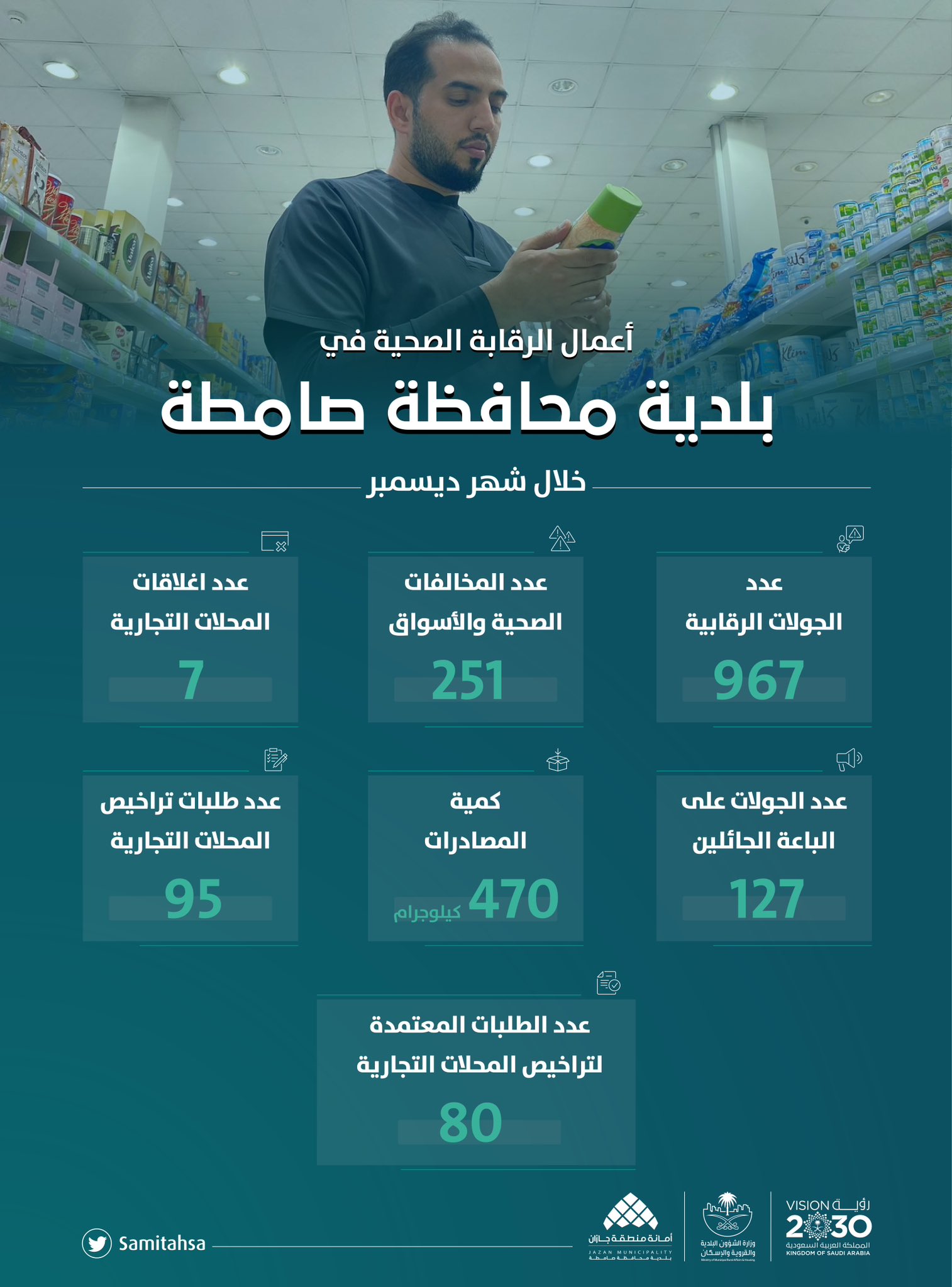 نفّذت أمانة منطقة جازان ممثلةً ببلدية محافظة صامطة خلال شهر ديسمبر الماضي 967 جولةً رقابيةً على المراكز التجارية والمنشآت الغذائية والمراكز والمطاعم؛ للتأكّد من تطبيق الاشتراطات الصحية والبلدية على جميع المحال التجارية والغذائية والتزامهم بالاشتراطات الصحية.