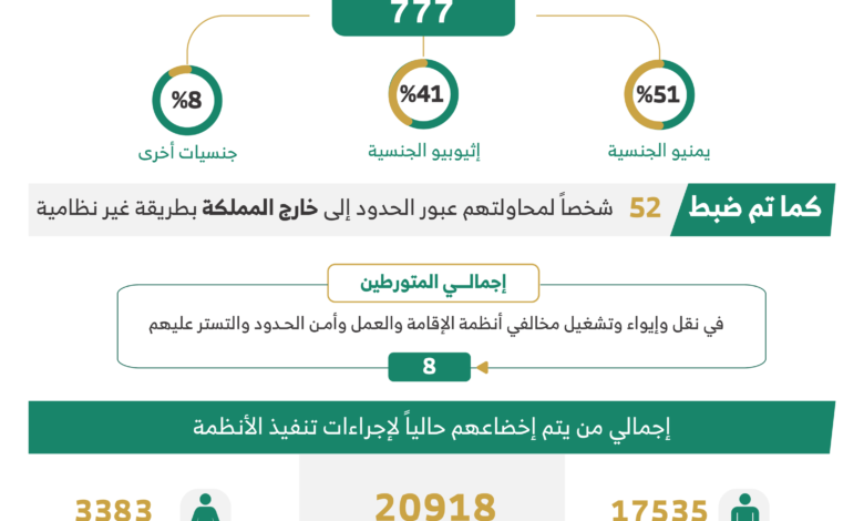 ثانياً: بلغ إجمالي من تم ضبطهم خلال محاولتهم عبور الحدود إلى داخل المملكة (777) شخصاً، (51%) منهم يمنيو الجنسية، و(41%) إثيوبيو الجنسية، و(8%) جنسيات أخرى، كما تم ضبط (52) شخصاً لمحاولتهم عبور الحدود إلى خارج المملكة بطريقة غير نظامية.