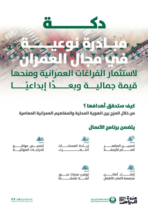 تعتزم أمانة منطقة الرياض تنفيذ مشروع “دكة حي ظهرة لبن” التي تمزج فيها بين الهوية المحلية والمفاهيم العمرانية المعاصرة، وذلك بعد اعتماد الأهالي المشروع في فعالية تم تنظيمها بالتعاون مع عزوة الرياض بناءً على تصويتهم على الخيارات الأكثر ملائمة لتوفير بيئة مجتمعية جاذبة.