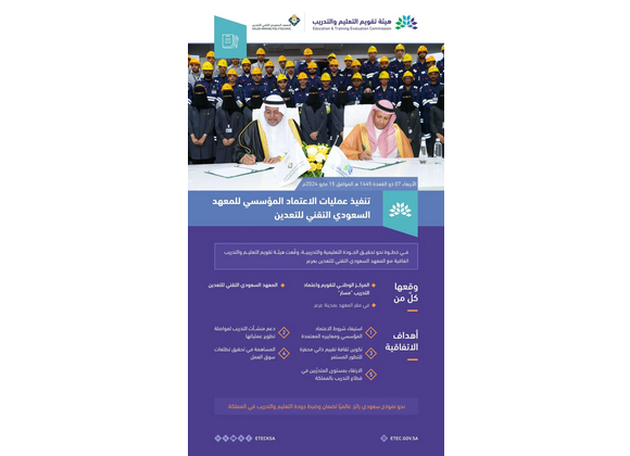 وتهدف الاتفاقية إلى تنفيذ عمليات الاعتماد المؤسسي للمعهد، حيث يُعدُّ الاعتماد المؤسسي اعترافًا رسميًا تمنحه الهيئة يفيد أن المنشأة التدريبية استوفت شروط الاعتماد المؤسسي ومعاييره المعتمدة لفترة زمنية محددة، بهدف دعم منشآت التدريب لمواصلة تطوير عملياتها وتكوين ثقافة تقييم ذاتي محفزة للتطور المستمر، والإسهام في تحقيق تطلعات سوق العمل، وردم الهوة بين قطاع التدريب ومتطلبات جهات التوظيف.