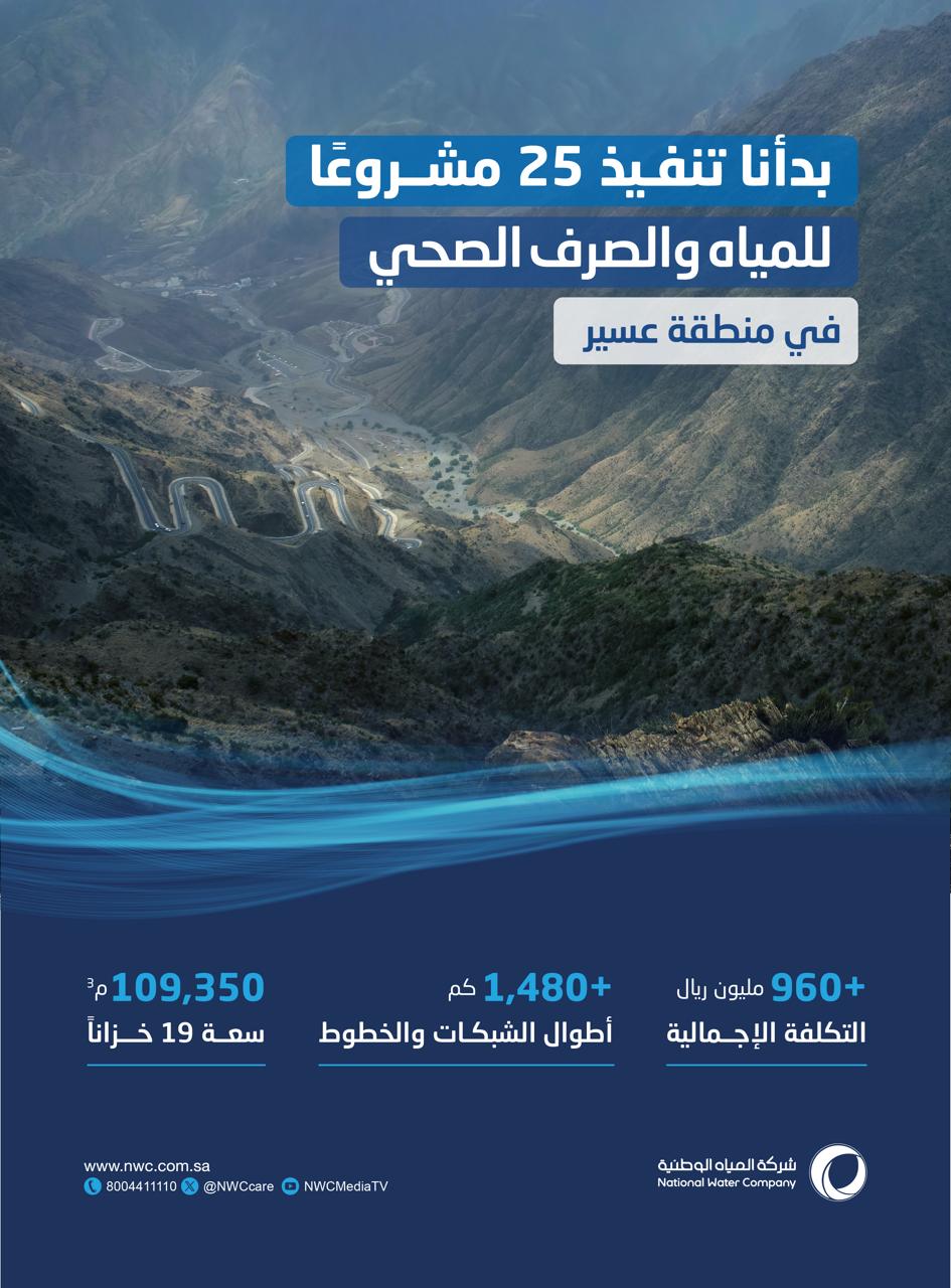 أعلنت شركة المياه الوطنية أنها بدأت في تنفيذ (25) مشروعًا للمياه والصرف الصحي بمنطقة عسير بالقطاع الجنوبي، وبأطوال خطوط وشبكات تجاوزت (1,481) كيلو مترًا طوليًا، وبكلفة إجمالية تجاوزت (960) مليون ريال، وذلك ضمن جهودها المستمرة في تنفيذ خططها الاستراتيجية لتهيئة البنى التحتية في كلٍ من قطاعي المياه والخدمات البيئية، واستنادًا إلى مبادراتها المُعدة لرفع نسب تغطيتها بالخدمات التي تقدمها لعملائها.