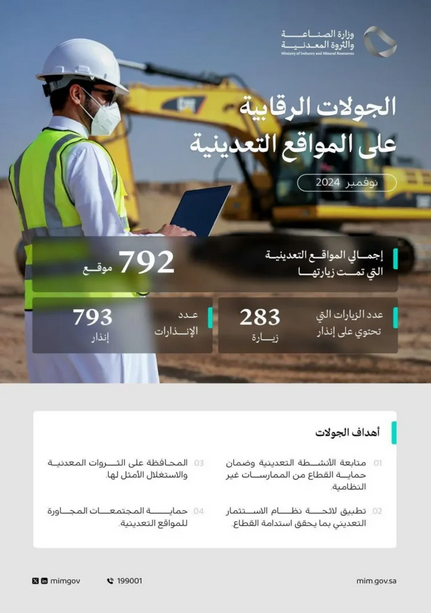 نفذت وزارة الصناعة والثروة المعدنية 792 جولة رقابية على عددٍ من المواقع التعدينية، في مختلف مناطق المملكة خلال شهر نوفمبر الماضي، ووجّهت 793 إنذارًا للمواقع التعدينية المخالفة لنظام الاستثمار التعديني، تطبيقًا لمبدأ الإنذار قبل إقرار المخالفة.
