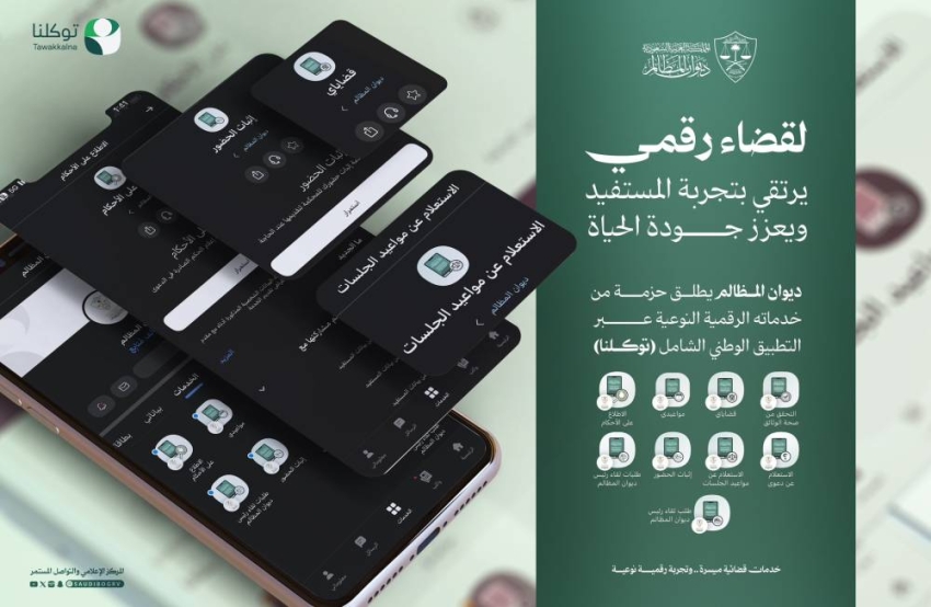 أطلق ديوان المظالم الحزمة الثانية من خدماته الرقمية عبر (توكلنا) -التطبيق الوطني الشامل لخدمات الجهات الحكومية-، حيث اشتملت الحزمة التي تم إطلاقها مع بداية الربع الثاني من العام 2025، على خدمات قضائية رقمية تمثلت في: (الاستعلام عن الدعاوى، ومواعيد الجلسات، وخدمة إثبات الحضور، وخدمتَي طلب لقاء معالي رئيس ديوان المظالم).