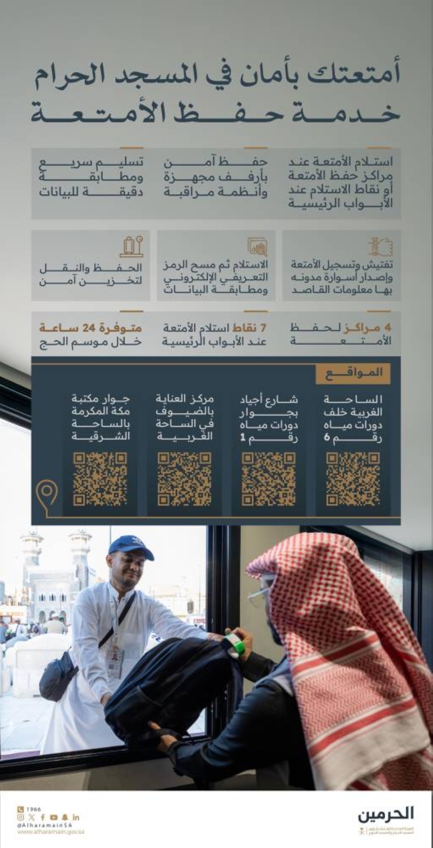وحددت الهيئة 4 مراكز لحفظ الأمتعة، وهي الساحة الغربية خلف دورات مياه رقم 6، وشارع أجياد بجوار دورات المياه رقم 1، ومركز العناية بالضيوف في الساحة الغربية، وجوار مكتبة مكة المكرمة بالساحة الشرقية، وتعمل على مدار الساعة خلال موسم الحج، إضافة إلى 7 نقاط استلام الأمتعة عند الأبواب الرئيسية.