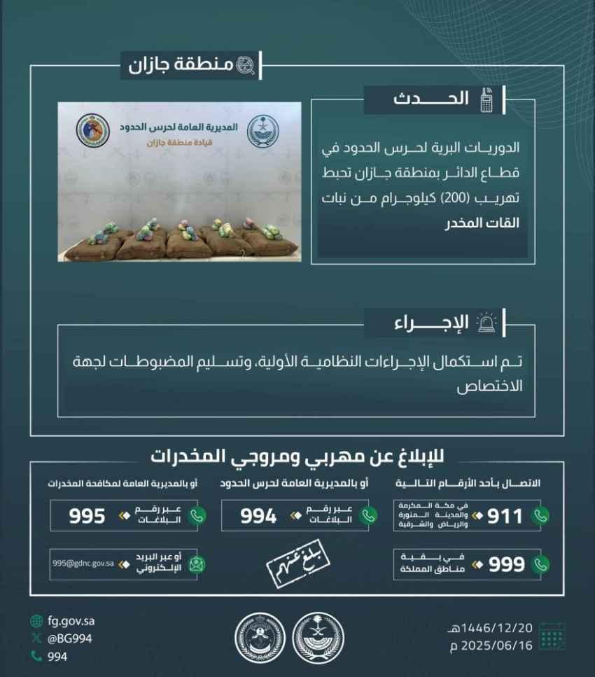 أحبطت الدوريات البرية لحرس الحدود في قطاع الدائر بمنطقة جازان تهريب (200) كيلوجرام من نبات القات المخدر، واستُكملت الإجراءات النظامية الأولية، وسُلمت المضبوطات لجهة الاختصاص.