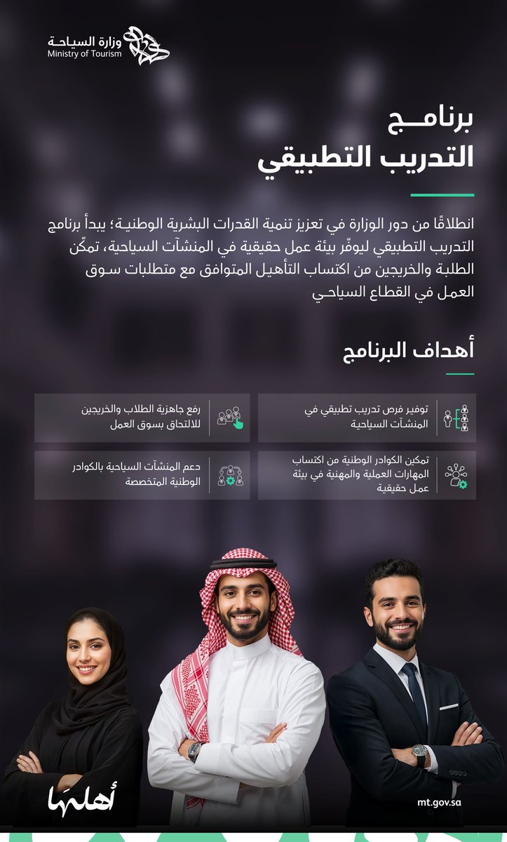أعلنت وزارة السياحة عن إطلاق برنامج التدريب التطبيقي، في إطار جهودها المستمرة لتنمية القدرات الوطنية وتطوير الكفاءات البشرية في القطاع السياحي. يهدف البرنامج إلى توفير بيئة عمل واقعية داخل المنشآت السياحية في المملكة، مما يتيح للطلاب والخريجين اكتساب المهارات العملية والمهنية اللازمة للانخراط في سوق العمل بكفاءة.