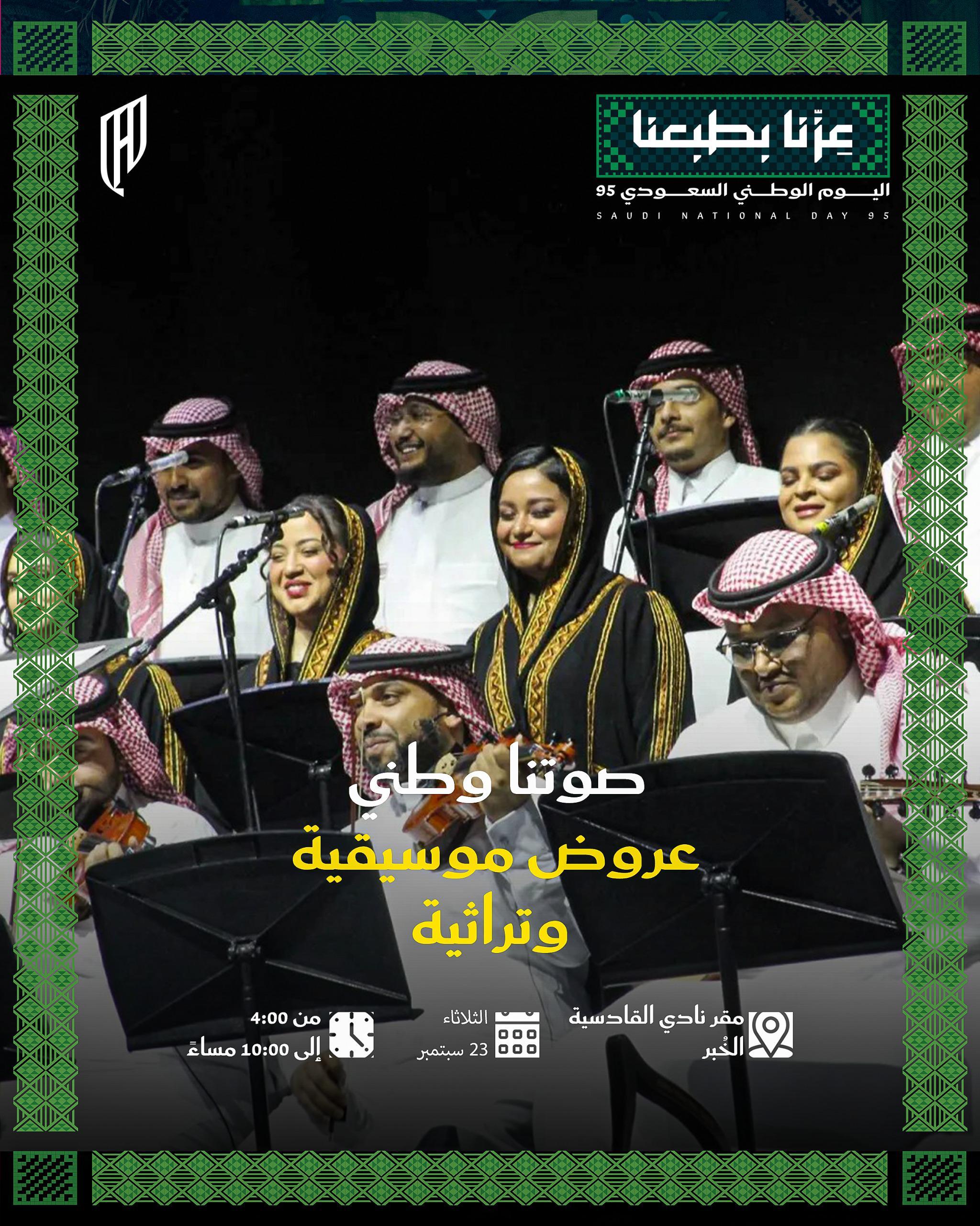 – حين يلتقي التراث بالموسيقى وتُضاء سماء الخبر بأهازيج سعودية خالصة، يقدّم نادي القادسية احتفاله باليوم الوطني الـ95 تحت شعار “من خير هالأرض”، بمشاركة أهالي مدينة الخبر.