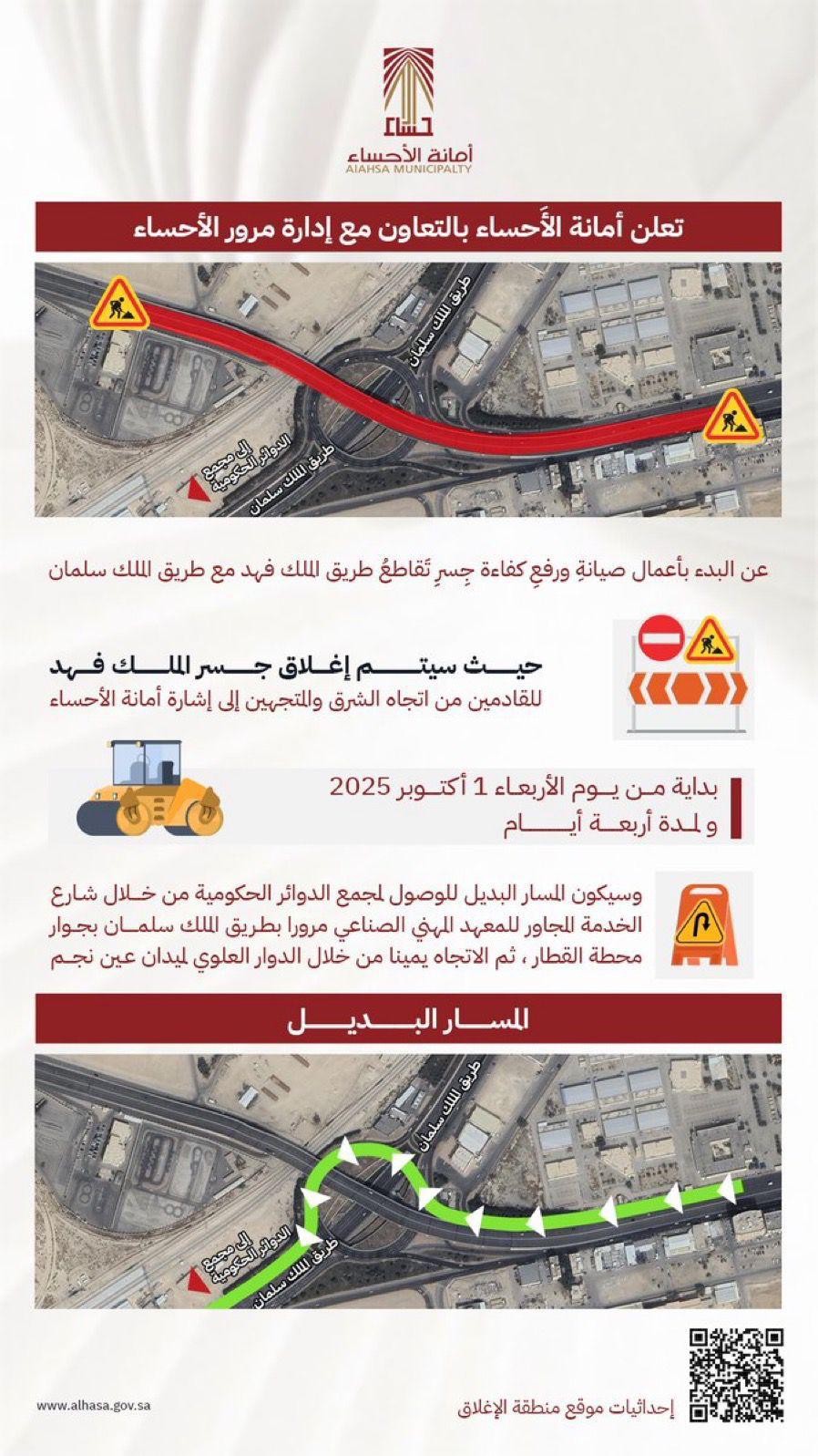 – اعلنت أمانة محافظة الاحساء بالتعاون مع إدارة مرور المحافظة عن البدء في أعمال صيانة ورفع كفاءة جسر تقاطع طريق الملك فهد مع طريق الملك سلمان. سيتم إغلاق جسر الملك فهد للقادمين من اتجاه الشرق والمتجهين إلى إشارة أمانة الأحساء، ابتداءً من يوم غدا الأربعاء الموافق 1 اكتوبر 2025م، ولمدة أربعة أيام.