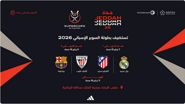 كشفت وزارة الرياضة عن أطراف مباراتي دور نصف نهائي بطولة كأس السوبر الإسباني 2026، التي تستضيفها المملكة العربية السعودية بمشاركة أربعة من أبرز الأندية الإسبانية، هي: ريال مدريد، برشلونة، أتلتيكو مدريد، وأتلتيك بلباو.