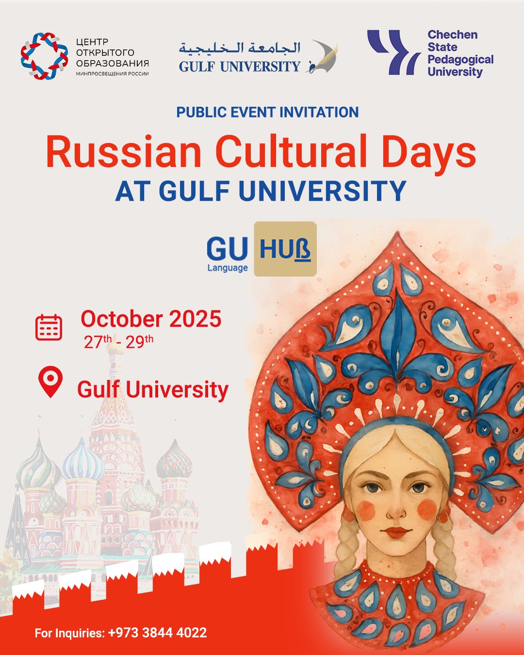 – ودعت الجامعة في هذا الصدد إلى اكتشاف جمال وعمق الثقافة الروسية والاحتفال بروح الصداقة والتعاون الثقافي في اجواء احتفائي بين شعبي البلدين البحرين وروسيا.