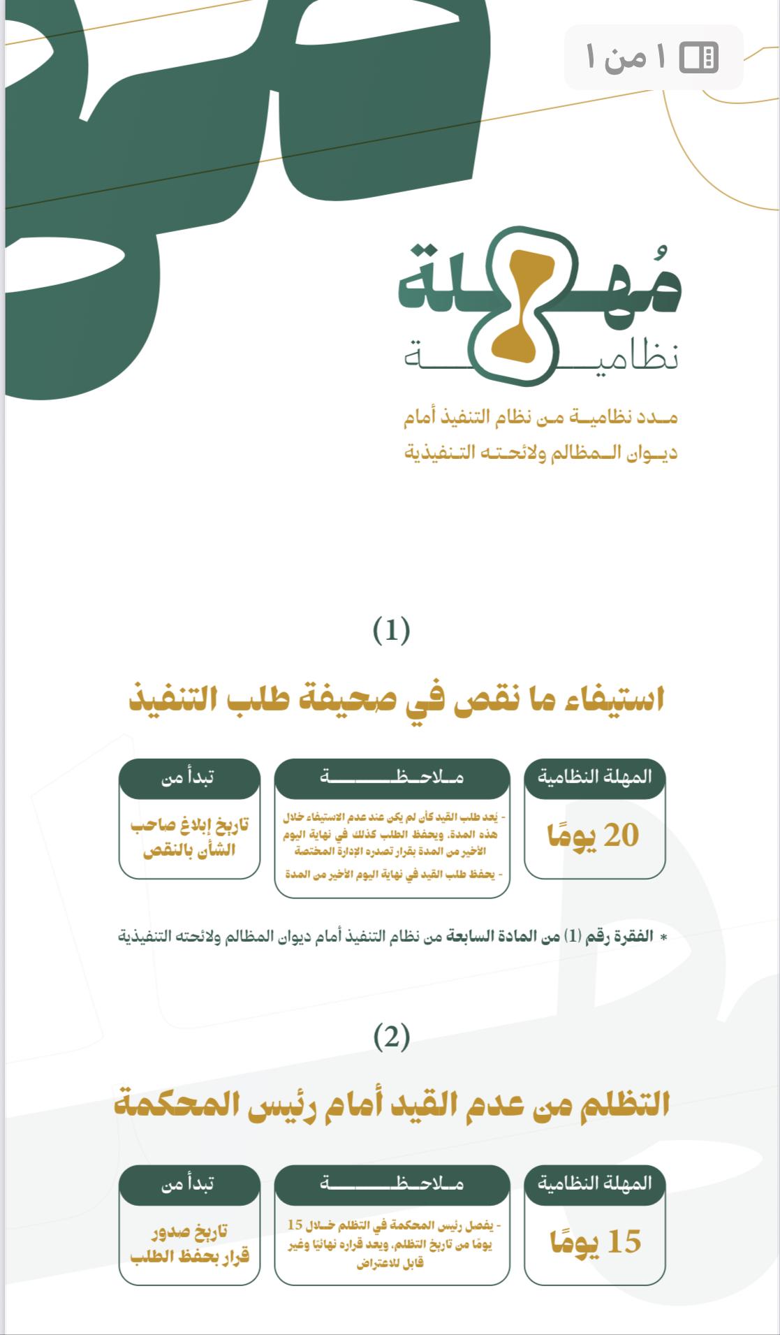 – وتضمّن الملف أبرز المدد النظامية في دعاوى التنفيذ والمنازعات والإجراءات التنفيذية، من أهمها مهلة عشر سنوات للمطالبة بالأداء، وثلاثون يومًا للمطالبة قبل طلب التنفيذ، وخمسة أيام في الدعاوى المستعجلة، إضافةً إلى تحديد مدد أوامر التنفيذ وإنذارات الجهات الإدارية والوقف والإجراءات اللاحقة لها.