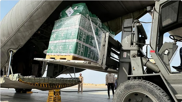 وتحمل الطائرة السعودية الـ(71) على متنها سلالًا غذائية وحقائب إيوائية، تمهيدًا لنقلها إلى المتضررين من الشعب الفلسطيني الشقيق داخل قطاع غزة.