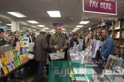 الرئيس الاميركي باراك اوباما يتسوق في مكتبة صغيرة في واشنطن في خطوة لدعم المتاجر الصغيرة