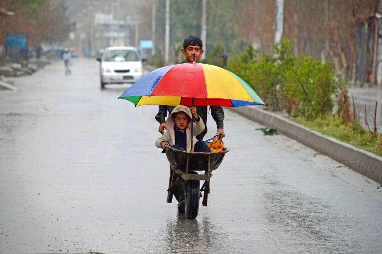 صبي افغاني يدفع شقيقه الاصغر الجالس في عربة يدوية في يوم ماطر قرب جلال اباد